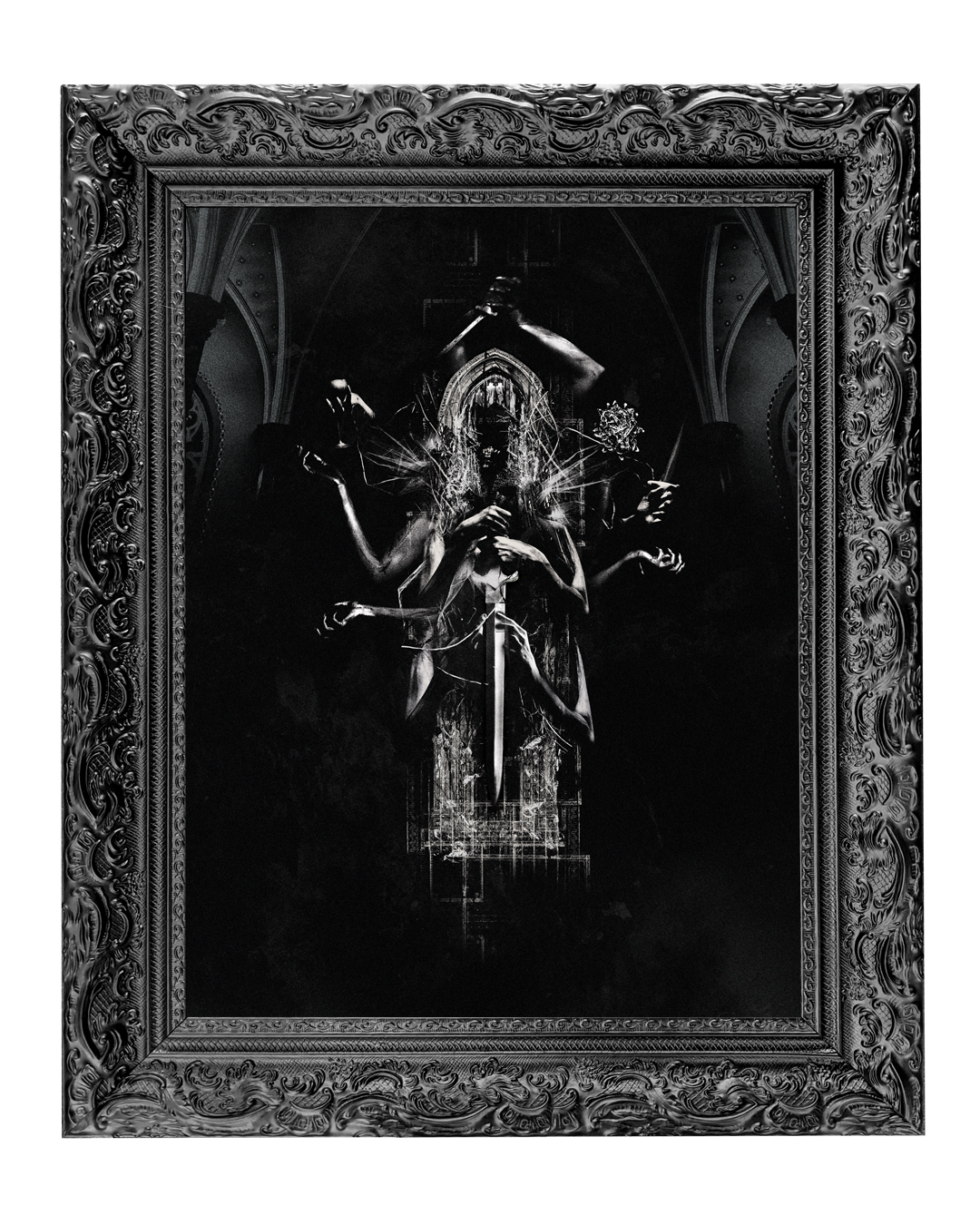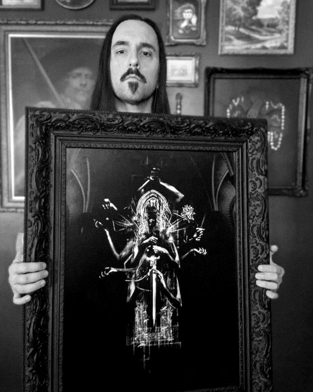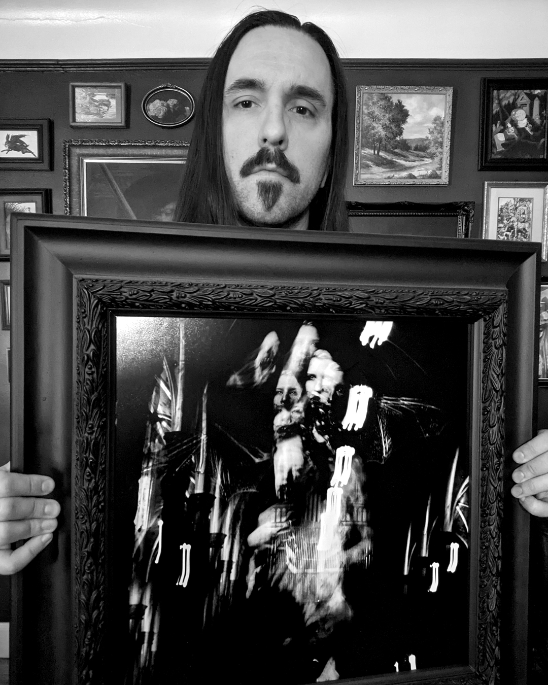 I thrift/ salvage/ garbage pick/ repurpose/ accept donated old, ornate frames. Repairing and painting, then printing the art to the custom size. Taking them to a professional framer for the dry mount and backing.